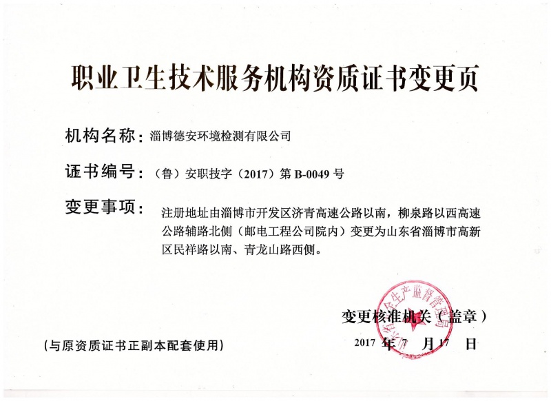 2017年7月8日,完成了計(jì)量認(rèn)證(地址變更)工作,并取得了計(jì)量認(rèn)證證書(shū)及職業(yè)衛(wèi)生技術(shù)服務(wù)機(jī)構(gòu)乙級(jí)資質(zhì)證書(shū)變更頁(yè)。